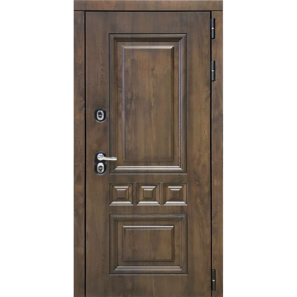 Внешняя отделка: МДФ панель 16 мм влагостойкая, винорит Nussbaum + патина черная. + Декоративные МДФ наличники.
